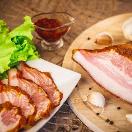 Состав продукта: грудобрюшная и/или грудореберная часть свиных полутуш с ребрами или без, с хрящами или без, в шкуре или без, вода питьевая, комплексная пищевая добавка (регуляторы кислотности (Е451, Е450), загустители (Е407, Е415, Е1412), декстроза, животные белки, растительные волокна, усилитель вкуса и аромата Е621, антиокислитель Е316, агент желирующий Е508), соль пищевая йодированная (агент антислеживающий Е536), смесь посолочно-нитритная (соль, фиксатор окраски Е250), комплексная пищевая добавка (регуляторы кислотности (Е262, Е331), антиокислители (Е316, Е223), соль как носитель).Пищевая ценность: Белки- 7,3 г.; Жиры- 57,5 г.Энергетическая ценность в 100 г - 547 ккал (2288 кДж).