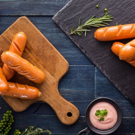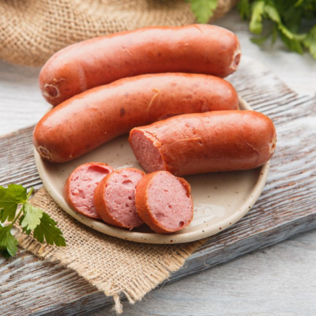 Состав: мясо птицы механической обвалки, мясо птицы кусковое (филе) цыпленка-бройлера, свинина жилованная жирная и/или шпик, жир свиной, вода питьевая, соль пищевая поваренная йодированная(агент антислеживающий Е536), клетчатка пшеничная, комплексная пищевая добавка (регулятор кислотности Е262, Е331, консервант (Е331,Е262), соль), комплексная пищевая добавка (сахар, соль, дрожжевой экстракт, ароматизаторы (бульон, курица)), комплексная пищевая добавка (регуляторы кислотности (Е262, Е331), антиокислители (Е316, Е223), соль).