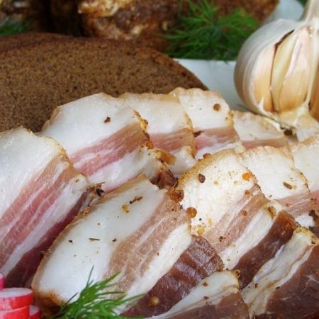 Состав: шпик боковой и/или хребтовой и/или обрезь шпика свиная, соль поваренная пищевая йодированная (агент антислеживающий Е536), тмин молотый, чеснок сушеный дробленый, кориандр молотый.