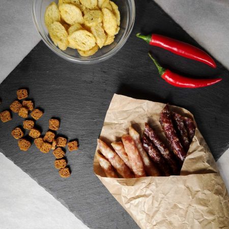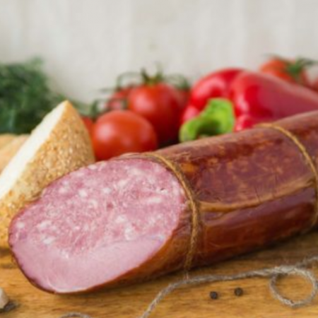 Состав: свинина жилованная полужирная, смесь посолочно-нитритная (соль поваренная пищевая выварочная экстра «Полесье» (содержит агент антислеживающий Е536), консервант, фиксатор окраски Е250, йодат калия), соль поваренная пищевая йодированная (агент антислеживающий Е536), комплексная пищевая добавка (усилитель вкуса (глютамат натрия Е621), ароматизатор, перец, лук, антиокислитель (эриторбат натрия Е316), чеснок, соль, гидролизованный растительный белок, гидрогенизированные растительные жиры), декстроза моногидрат, стартовые культуры (носитель: декстроза, чистые культуры бактерий) Готово к употреблению в пищу. Не требует тепловой обработки. Пищевая ценность: Белки- 17 г.; Жиры - 58 г. Энергетическая ценность в 100 г - 2440/590 кДж/ккал. РЦ BY 191300570.168-2019