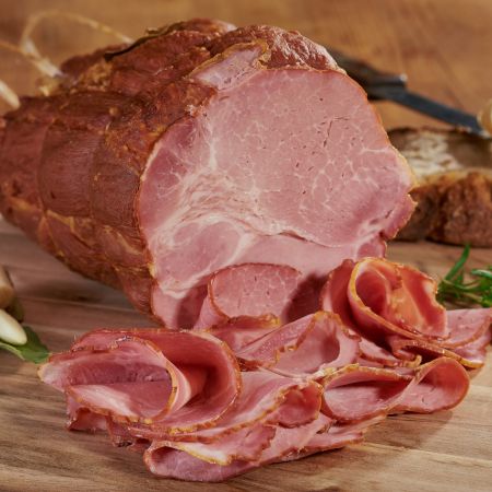 Состав: спинная часть с ребрами удаленными позвонками, в шкуре или без от свиных полутуш с толщиной шпика не более 3 см (или без него), вода питьевая, комплексная пищевая добавка (регуляторы кислотности (Е451, Е450), загустители (Е407, Е415, Е1412), декстроза, животные белки, растительные волокна, усилитель вкуса и аромата Е621, антиокислитель Е316, агент желирующий Е508), соль пищевая йодированная (агент антислеживающий Е536), смесь посолочно-нитритная (соль, фиксатор окраски Е250), комплексная пищевая добавка (регуляторы кислотности (Е262, Е331), антиокислители (Е316, Е223), соль как носитель).Пищевая ценность: Белки- 12,5 г.; Жиры- 32 г.Энергетическая ценность в 100 г – 336,8 ккал (1409 кДж).