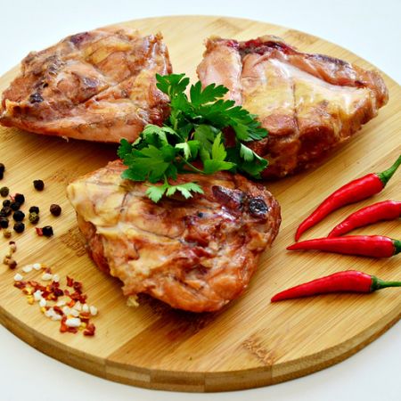 Состав: позвоночный столб от тушек кур, цыплят, цыплят-бройлеров, вода питьевая, комплексная пищевая добавка (регуляторы кислотности (Е451, Е450), сахара, усилитель вкуса (Е621), стабилизатор цвета (Е316), аромат бульона и жареной говядины, экстракты специй), соль пищевая йодированная (агент антислеживающий Е536), смесь посолочно-нитритная (соль, фиксатор окраски Е250), комплексная пищевая добавка (регуляторы кислотности (Е262, Е331), антиокислители (Е316, Е223), соль как носитель).Пищевая ценность: Белки- 21,0 г; Жиры- 17,0г.Энергетическая ценность в 100 г - 240 ккал (980 КДж).Условия хранения и срок реализации: 12 суток при температуре хранения (4±2)°C и ОВВ 70-80%; упакованные в пленку (пакеты) полимерные многослойные под вакуумом (без нарушения целостности упаковки) - 20 суток при температуре хранения (4±2)°C, при нарушении целостности упаковки 12 суток при температуре хранения (4±2)°C , но не более общего срока реализации.