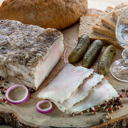 Состав: шпик боковой и/или хребтовой, вода питьевая, соль поваренная пищевая йодированная (агент антислеживающий Е536), натуральные пряности