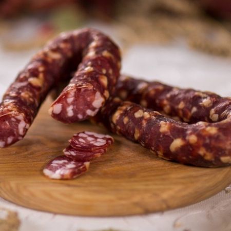 Состав: свинина жилованная полужирная, смесь посолочно-нитритная (соль поваренная пищевая выварочная экстра «Полесье» (содержит агент антислеживающий Е536), консервант, фиксатор окраски Е250, йодат калия), соль поваренная пищевая йодированная (агент антислеживающий Е 536), комплексная пищевая добавка (соль, ароматизатор, чеснок, перец, антислеживающий агент Е55, зелень, порошок ацеролы), декстроза моногидрат, стартовые культуры (носитель: декстроза, чистые культуры бактерий)Готово к употреблению в пищу. Не требует тепловой обработки.Пищевая ценность: Белки- 17 г.; Жиры - 58 г.Энергетическая ценность в 100 г - 2440/590 кДж/кКал.